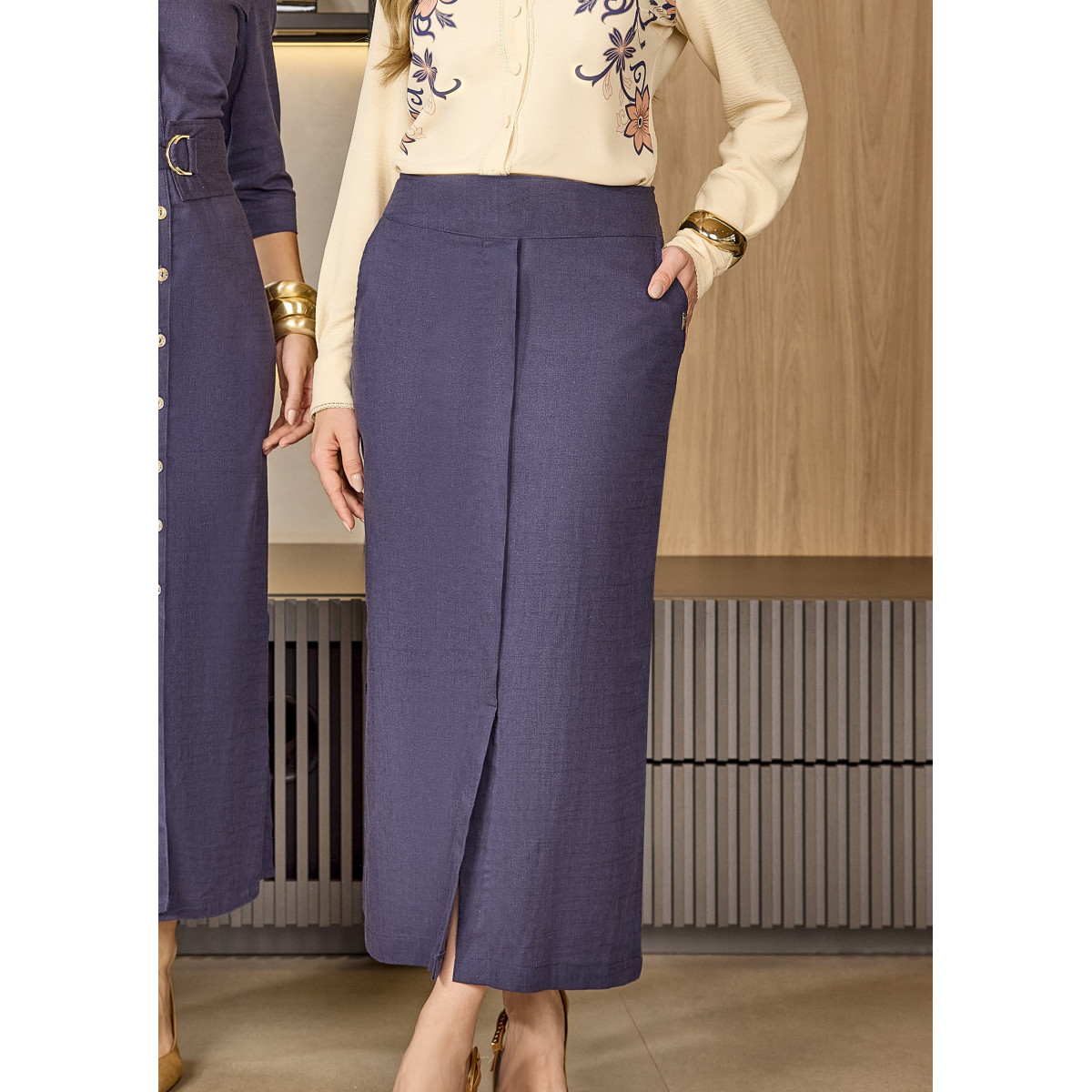 Na cor azul marinho, clássica e fácil de combinar, o modelo possui modelagem midi com caimento reto, valorizando a silhueta com conforto. O destaque fica por conta da vista falsa frontal, que cria um efeito elegante com leve abertura, proporcionando charme e mobilidade ao caminhar.