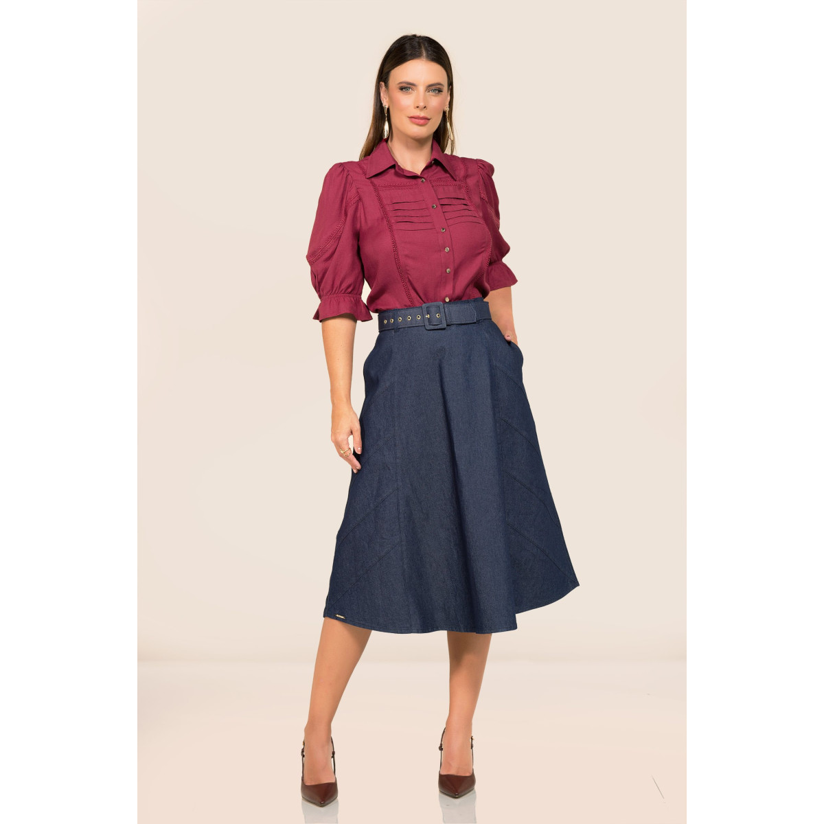 Versátil e elegante, essa camisa marsala feminina é perfeita para looks de trabalho, eventos ou produções casuais sofisticadas, combinando facilmente com saias, alfaiataria ou jeans.