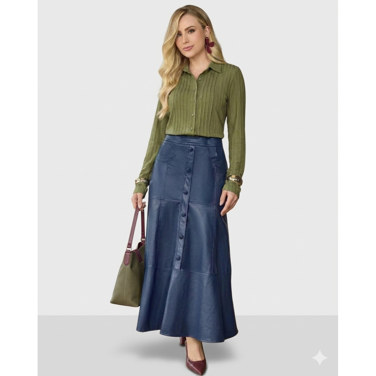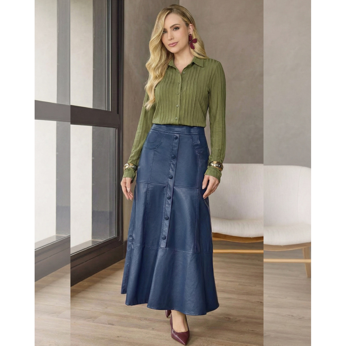 Etiquetas: saia midi saia couro saia azul marinho saia com botões saia elegante feminina saia evasê saia moda evangélica saia sofisticada D’azul Loja Maressa Fashion Indaiatuba SP
